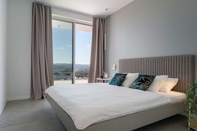 Mit Bedacht setzt sich der Grundriss aus zwei Geschossen, mit insgesamt 4 Schlafzimmern mit 4 angrenzenden Bädern, einem geräumigen lichtdurchfluteten Wohn- sowie Koch- und Essbereich zusammen. Abgerundet wird das Raumkonzept mit 4 großzügigen Terrassen, welche die spektakuläre Sicht auf den Sonnenaufgang und die Berge des Naturparks öffnen.
